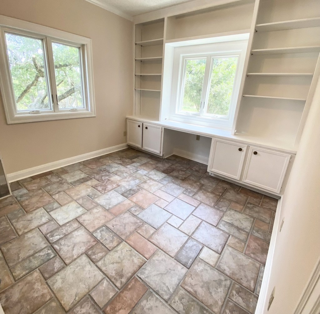 Before and after photos of refinished cabinets and shelving.